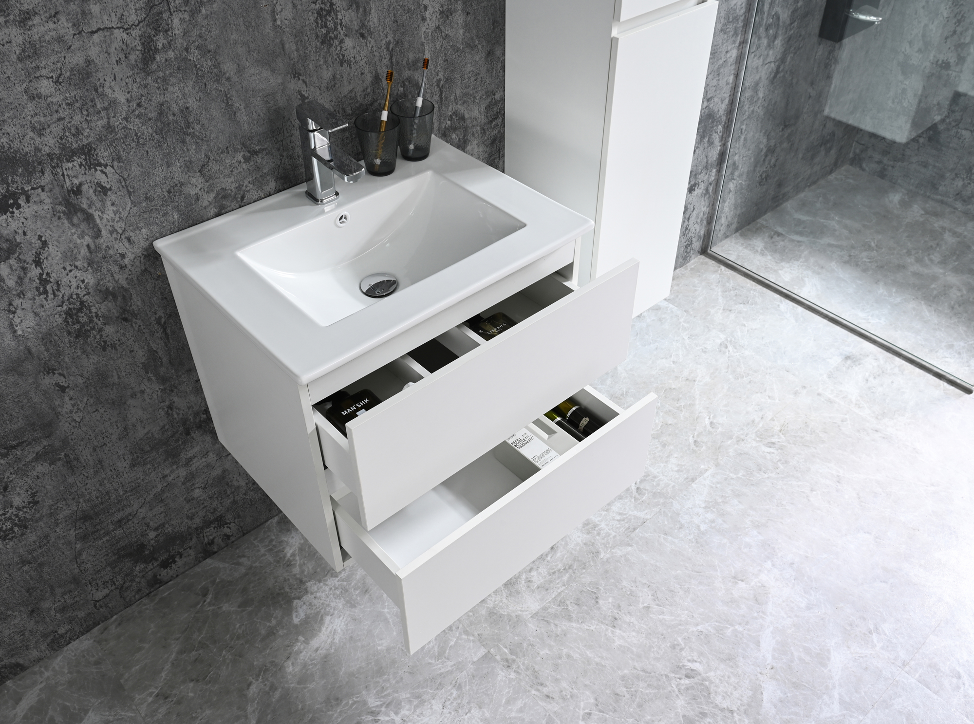 Der Badezimmer Unterschrank Corbo inklusive Keramik Waschbecken überzeugt durch sein modernes und zeitloses Erscheinungsbild. Der Unterschrank bietet genügend Stauraum für Deine Handtücher und Badezimmerutensilien. Dieser Unterschrank der Serie Corbo ist die ideale Ergänzung zu den Hochschränken der Serie Corbo, diese Kombination ergibt eine sehr schöne optische Einheit für Dein Badezimmer.