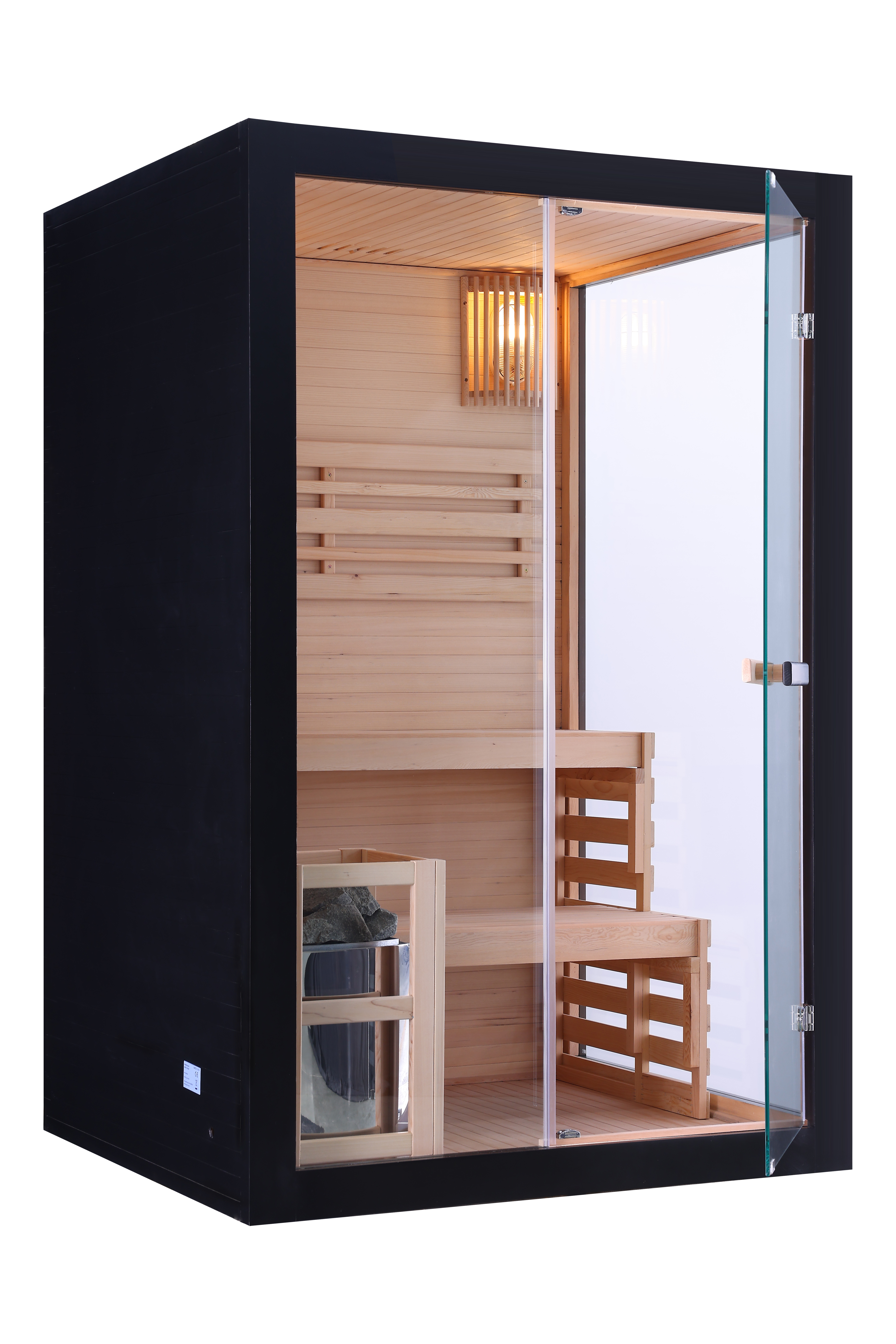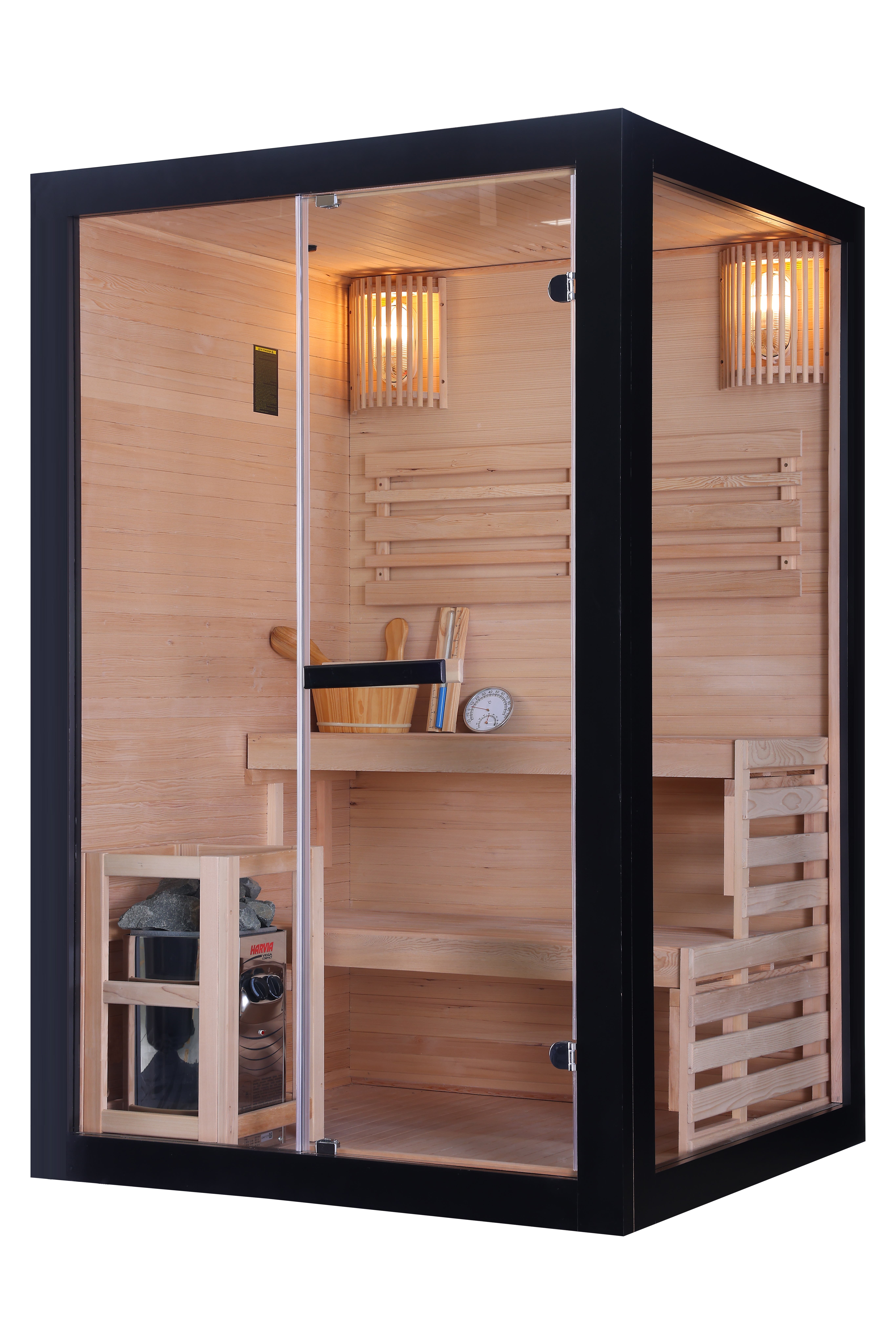 Die PANORAMA BLACK Sauna verbindet zeitloses Saunavergnügen mit modernem, stilvollem Design. Ihre elegante schwarze Optik und die großzügige Glasfront verleihen ihr einen exklusiven Charakter – perfekt für zwei Personen, die Entspannung und Ästhetik gleichermaßen schätzen.