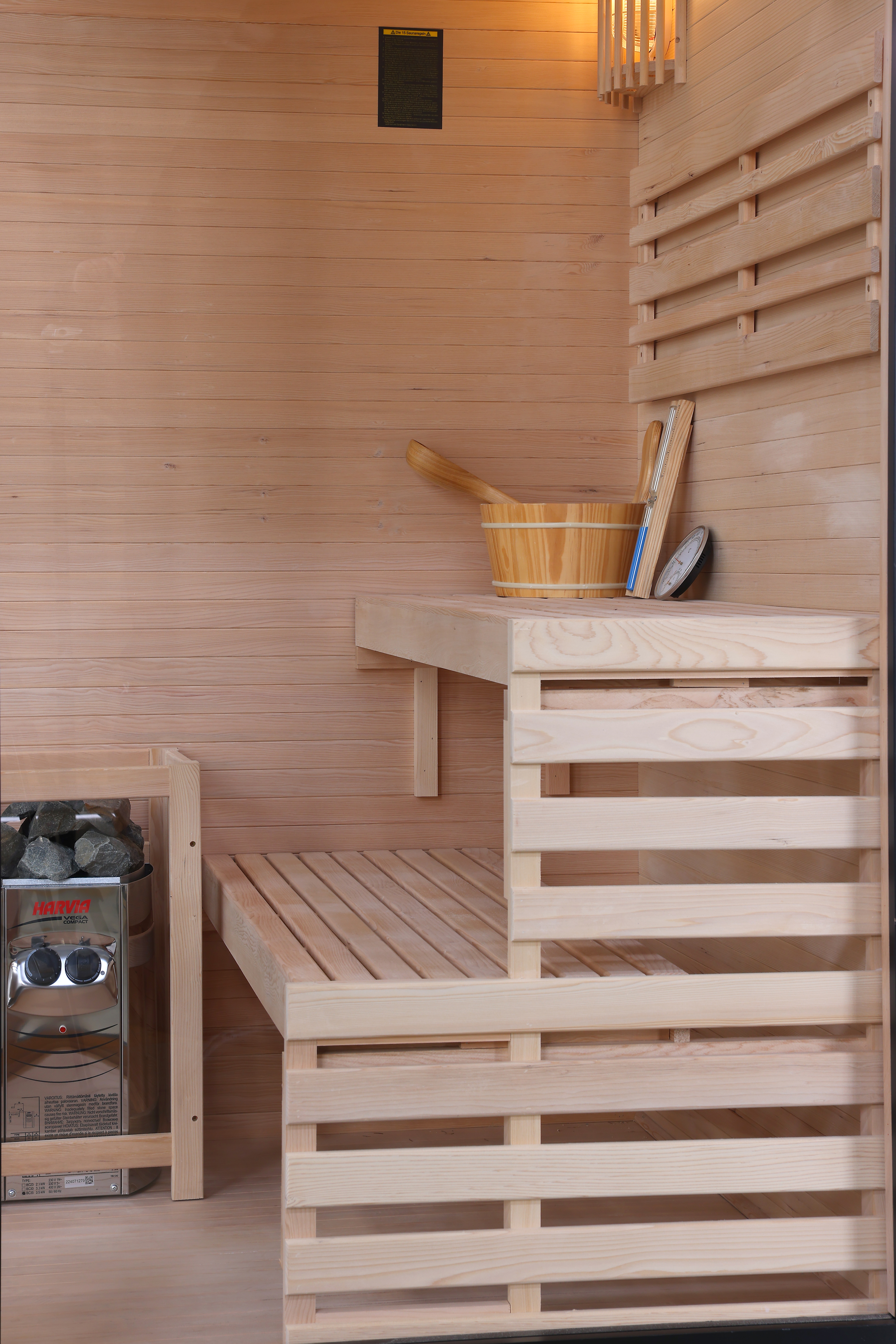 Zum Lieferumfang gehören praktisches Zubehör wie Kübel mit Schöpfer, Thermometer, Sanduhr und ein Ofenschutzgitter – alles, was Sie für ein sicheres und komfortables Saunaerlebnis benötigen.