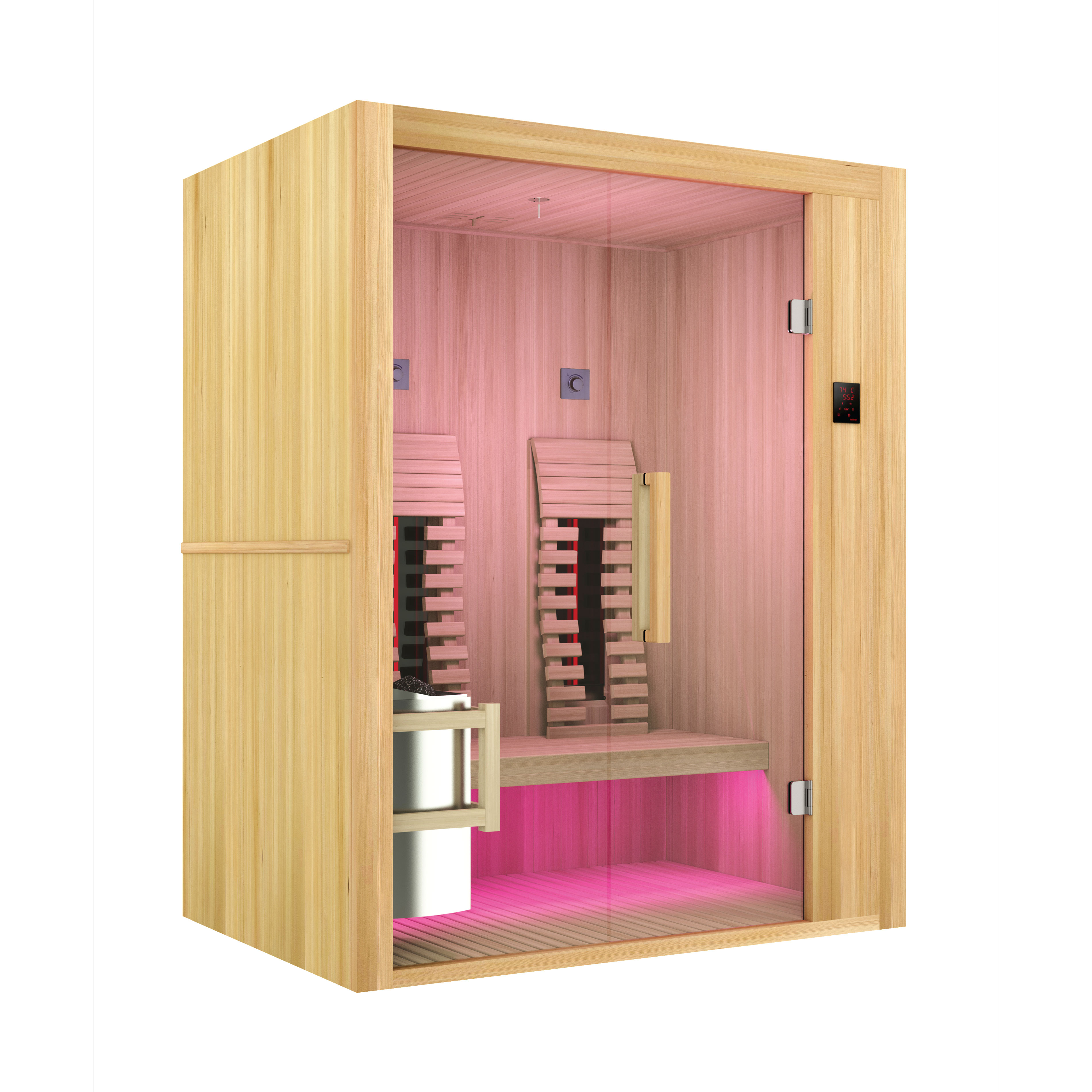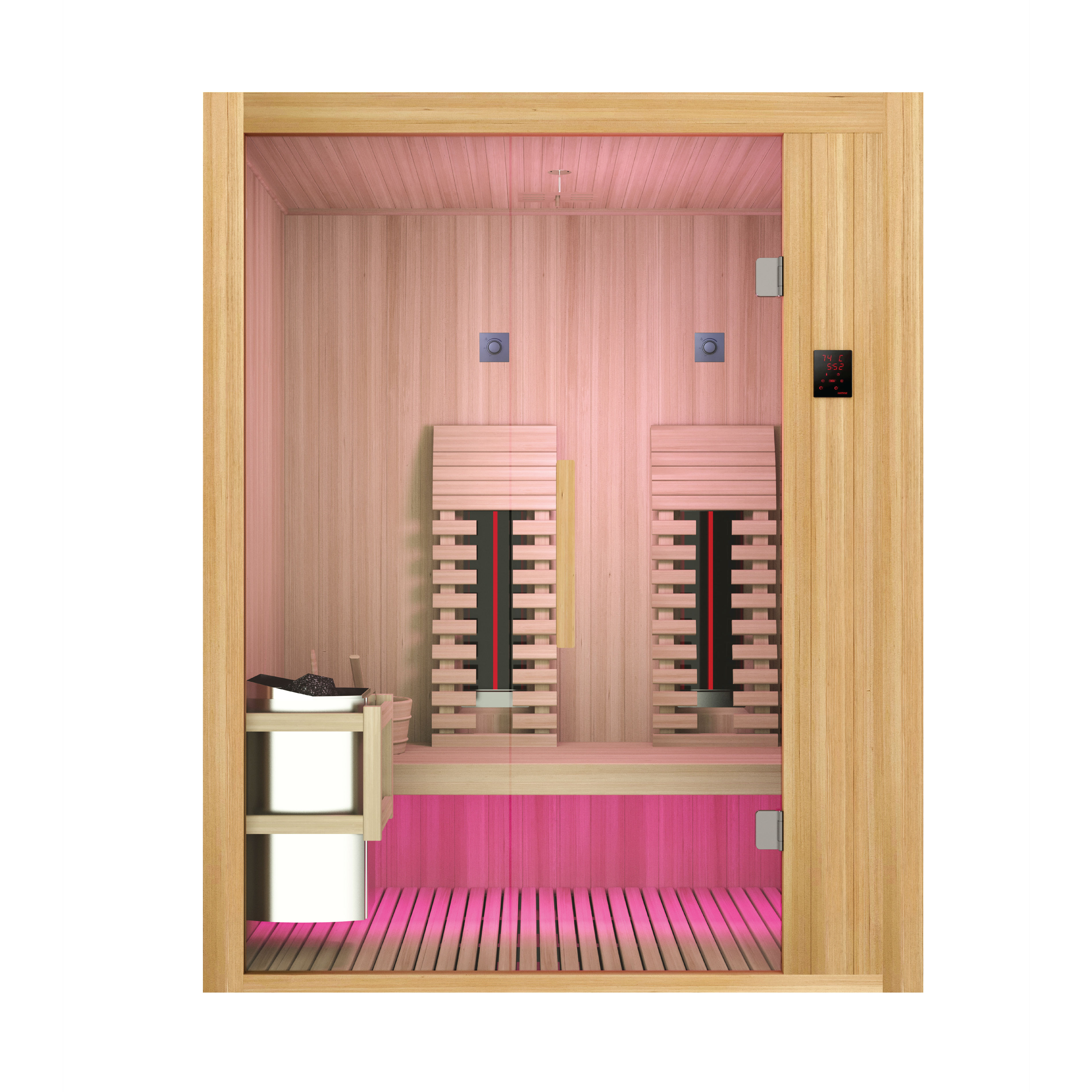 Der leistungsstarke Harvia Saunaofen mit 3,5 kW sorgt für authentische Saunawärme und wird durch zwei regelbare Vollspektrumstrahler à 400 Watt ergänzt, die gezielte Tiefenwärme spenden. So erleben Sie die Vorteile beider Wärmequellen in einer kompakten, stilvollen Einheit.